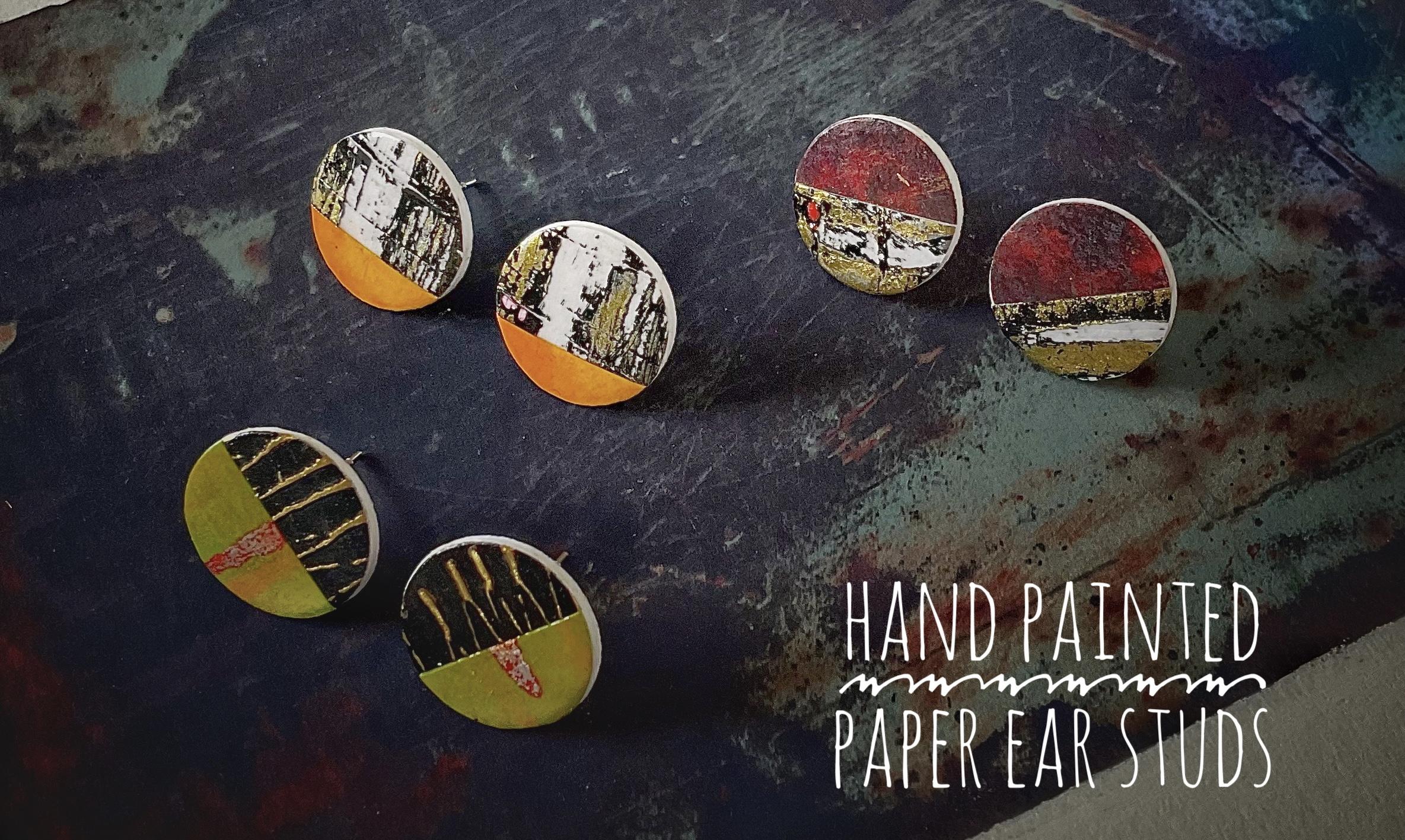 Bespoke handmade paper ear studs and brooches. All items are made from hand painted gilded and embossed papers using many layers of colour. Additions of gilding and embossing create new layers that are distressed by rubbing and sanding to expose the underlying layers.