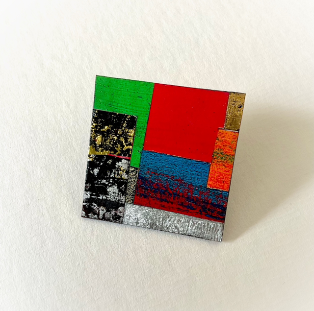 Bright bold custom brooch handmade using hand painted papers cut and arranged onto a laminated paper backing that is very durable and lightweight. Looks great on a coat lapel or a fine blouse.