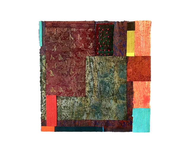 A printed card of an original artwork using hand painted, block printed Japanese papers and mixed fabrics with hand and machine stitch. 140 x 140 mm.