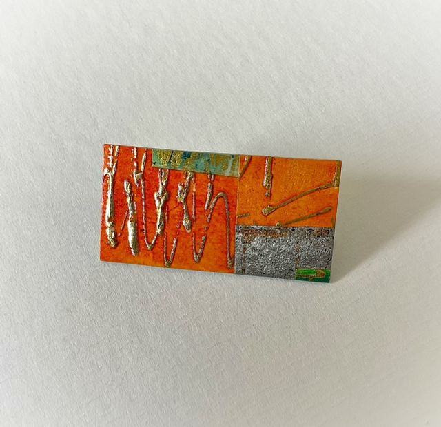 It’s all about the orange with this super vibrant hand gilded brooch with a tad of silver and green to set it off. Beautiful gently two toned brooch with a laminated paper backing making it both lightweight and very durable.